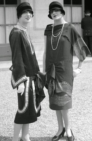 Vestidos de Dia: Vestidos simples, soltos e retos, frequentemente com detalhes geométricos ou art déco.